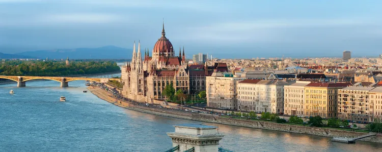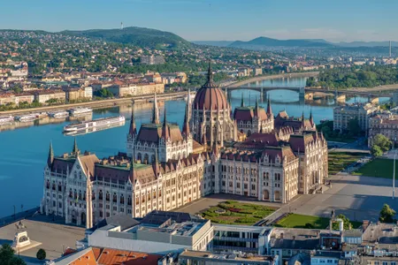 River cruise ship passing in front of the neo-gothic-style Hungarian Parliament Building with a bridge and tree-covered hills in the background; the river is calmand the sky is blue.