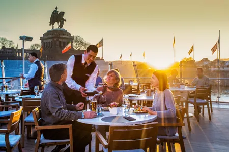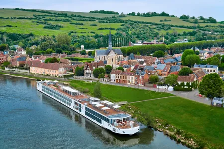 Aerial view of a cruise ship passing through a tree- and moss-covered river valley on a very still, deep blue river.