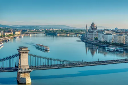 A river cruise ship sails toward the frame on a sunny day. In the foreground is the Budapest Parliament building with its many spires and central dome.  The words, “Twenty-One Rivers” appear in the center of the frame.