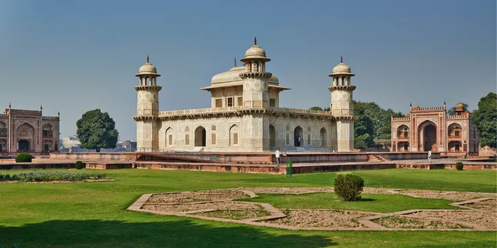 Watch the sun rise over the Taj Mahal before visiting the Itmad-ud-Daula Mausoleum, a Mughal masterpiece. This morning, rise before the sun and drive to the eastern bank of the Yamuna River. Here, watch as the day begins, the colors of dawn playing off the marble of the Taj Mahal and the meandering river, set against a lush landscape. After, drive to India’s first marble tomb, the Itmad-ud-Daula Mausoleum, also known as the “Baby Taj” and as a predecessor to the Taj Mahal. Commissioned by Nur Jahan for her father and built to look like a jewel box in the center of symmetrical gardens, the tomb features intricate stone inlays, set in floral and geometric patterns that can be seen on both the marble exterior and domed interior. As you step inside the tomb, see the lattice work that graces the windows and the final resting place of the Mughal Empire’s second ruler.