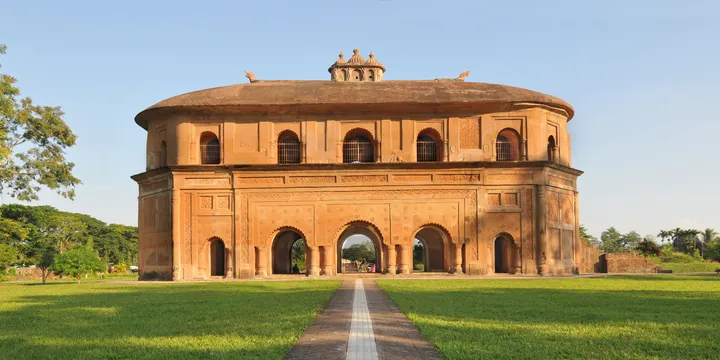 See the historic remnants of an Ahom city at Sibsagar, including a sports pavilion and a temple. This morning, travel from Nimati Ghat to Sivasagar, the former 18th-century capital of the Ahom Kingdom, a people who ruled in Assam for six centuries. Here, explore its architectural remnants. Discover one of the oldest amphitheaters in Asia, Rang Ghar, a royal sports pavilion where events like bull fighting and wrestling took place. Ascend the stairs to view the surroundings. Continue to a complex of Hindu temples, dedicated to the gods Shiva, Vishnu and Durga, where you will visit Siva Dol. You may choose to purchase an offering from a vendor outside the temple before stepping inside, watching as worshippers burn ghee in terra-cotta plates. Finally, visit a local establishment to learn about Assam’s tea industry, which produces around fifty percent of the country’s tea.