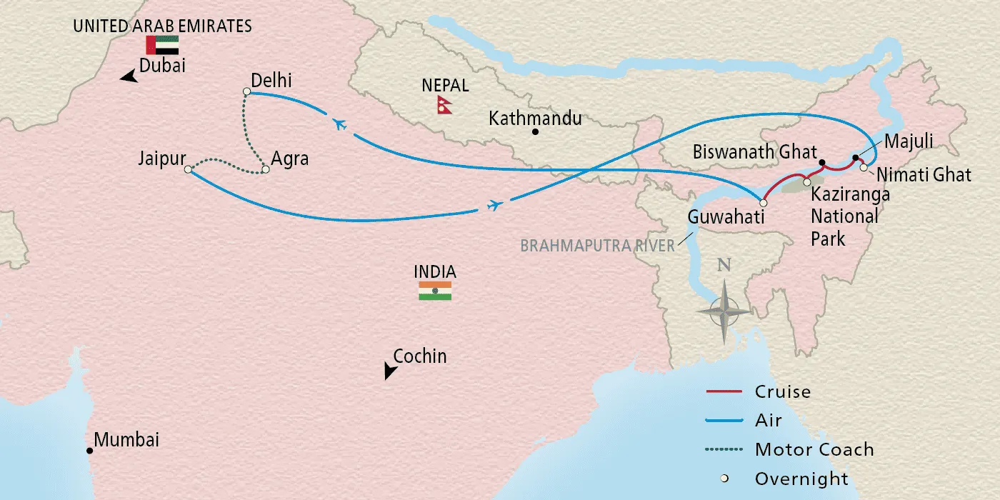 Explore Agra’s fabled Taj Mahal, stroll through the winding streets of Old Delhi and witness Jaipur’s Palace of Winds as you delve into the rich history of India’s Golden Triangle. Discover the cultures of Majuli, one of the world’s largest river islands, and search for the one-horned rhinos and buffalos of Kaziranga National Park as you sail the Brahmaputra River. Encounter thriving riverside villages and see the temple of Guwahati.