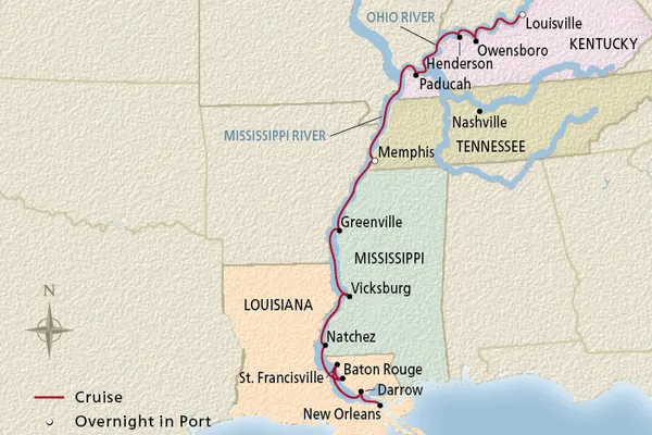 Stroll the charming streets of historic Vicksburg and explore the city’s stately homes. Begin your tour at Christ Episcopal Church, built in 1846, and admire its towering pinnacles and four Tiffany windows. Inside, a church rector will recount the history of the church and its relation to the Civil War. From here, discover the surrounding neighborhood and learn about its grand architecture during a guided walk. Depending on availability, you will visit the nearby Wahl-Schaffer Cottages—each featuring a distinctive architectural style—and then embark on a short trip to the Martha Vick House, which was built during the 1800s. After gaining valuable insights into Vicksburg’s past, you may stay in town for further exploration or return to your ship.