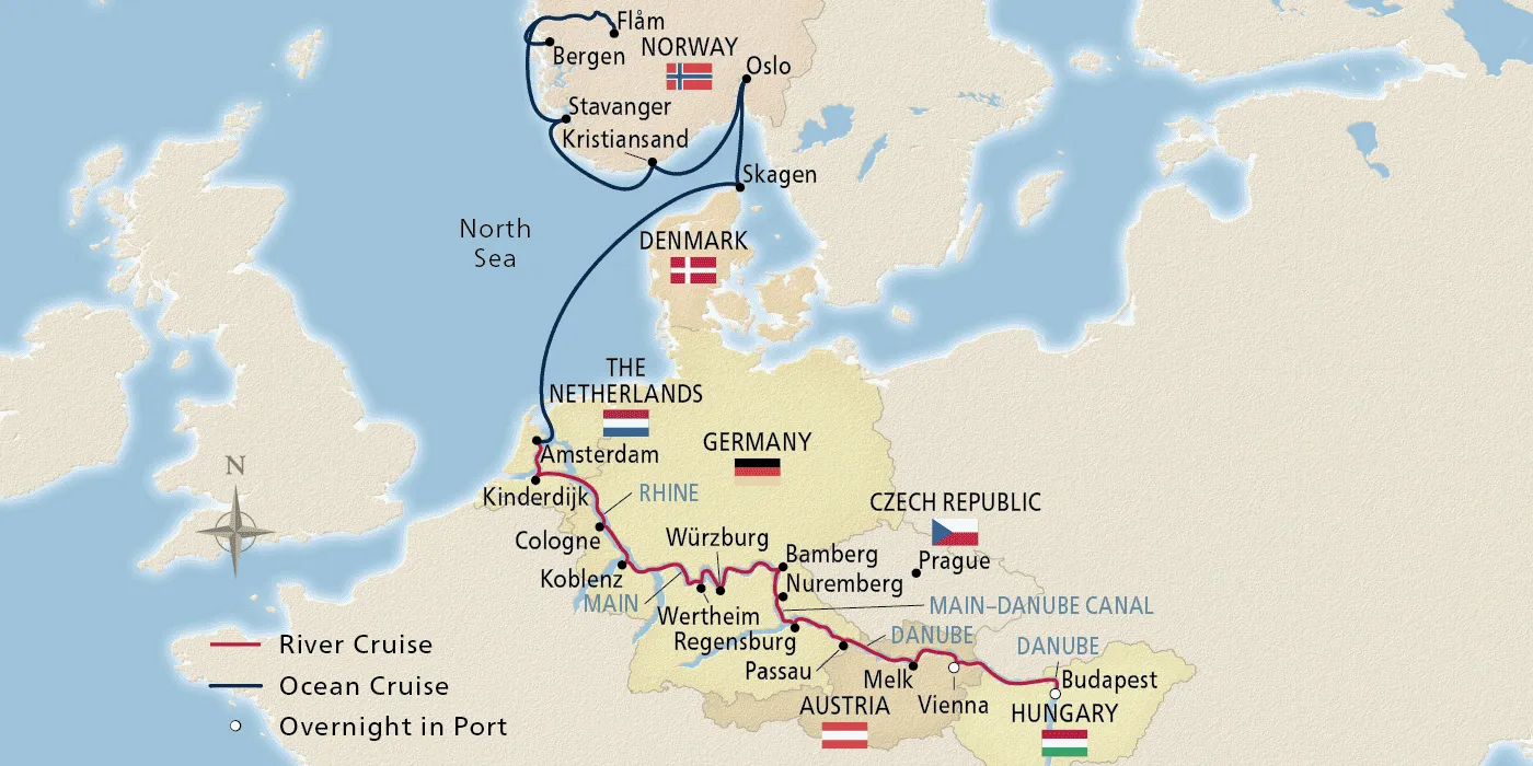 Embark on an unforgettable voyage that seamlessly blends river and ocean exploration, bookended by Budapest's cultural riches and Norway's pristine shores. Sail the legendary Danube to marvel at Austria's vineyard-laden Wachau Valley. Discover Vienna's musical heritage and see the Rhine's impressive castles. Admire Holland's iconic windmills and sail the historic North Sea. Glimpse the dramatic fjords of Norway and discover charming Bergen and scenic Flåm.