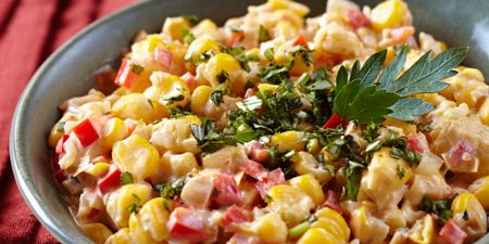 This dish of fresh corn with trinity vegetables and Cajun seasonings is traditional Acadian French fare. If you cannot find tasso ham, just use smoked sausage, country ham or bacon. This version is a robust side dish, perfect with blackened fish; or you can add crawfish, shrimp, crab or toasted okra to serve it as a main dish.
